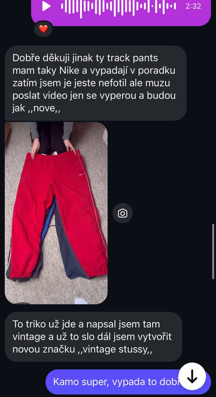 Ne, není. Všechno oblečení od dodavatelů je originální vintage – tedy secondhand nebo deadstock kousky od známých značek (Nike, Adidas, Levi’s, atd.). Nejde o padělky ani napodobeniny, ale o originály z minulých let, které mají dnes znovu hodnotu.